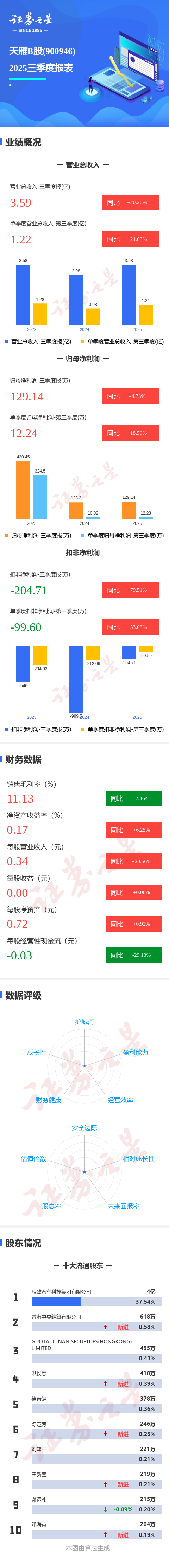 证券之星消息,天雁B股2025年三季报显示,前三季度公司主营收入3.59亿元,同比上升20.26%;归母净利润129.14万元,同比上升4.73%;扣非净利润-204.71万元,同比上升79.52%;其中2025年第三季度,公司单季度主营收入1.22亿元,同比上升24.04%;单季度归母净利润12.24万元,同比上升18.57%;单季度扣非净利润-99.6万元,同比上升53.03%;负债率36.2%,财务费用-98.55万元,毛利率11.13%。