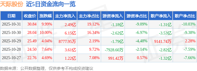 证券之星消息,天际股份10月31日涨停收盘,收盘价30.84元。该股于9点31分涨停,未打开涨停,截止收盘封单资金为2.42亿元,占其流通市值1.57%。