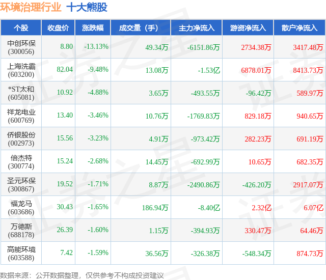 个股表现方面,环境治理行业当日领跌股为中创环保(300056),该股当日报收8.8,下跌13.13%,成交量49.34万,主力资金净流出6151.86万元。上海洗霸(603200)以下跌9.48%紧随其后,该股当日成交量13.08万,主力资金净流出1.53亿元。除此之外,*ST太和(605081)、祥龙电业(600769)、侨银股份(002973)均进入当日熊股之列。具体个股列表见下表: