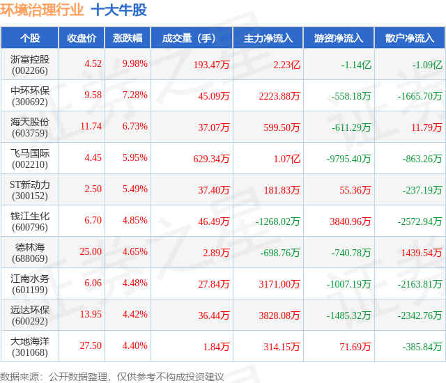 个股表现方面,环境治理行业当日领涨股为浙富控股(002266),该股当日报收4.52,上涨9.98%,成交量193.47万,主力资金净流入2.23亿元。中环环保(300692)以上涨7.28%紧随其后,该股当日成交量45.09万,主力资金净流入2223.88万元。除此之外,海天股份(603759)、飞马国际(002210)、ST新动力(300152)均进入当日牛股之列。具体个股列表见下表: