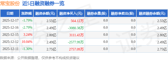 常宝股份融资融券信息显示,融资方面,当日融资买入3948.05万元,融资偿还3383.92万元,融资净买入564.12万元。融券方面,融券卖出0.0股,融券偿还0.0股,融券余量0.0股,融券余额0.0万元。融资融券余额2.55亿元。