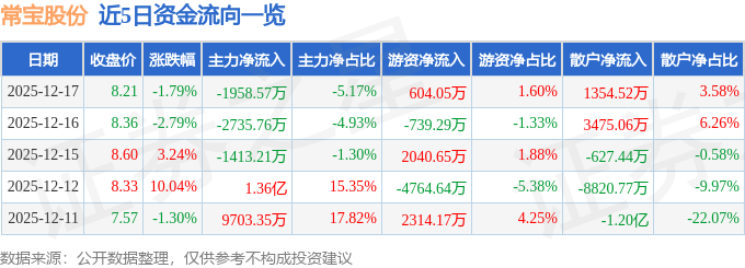 证券之星消息,截至2025年12月17日收盘,常宝股份(002478)报收于8.21元,下跌1.79%,换手率6.44%,成交量46.54万手,成交额3.79亿元。