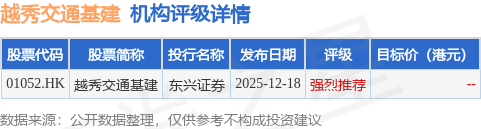 截至2025年12月19日收盘,越秀交通基建(01052.HK)报收于4.59港元,上涨0.44%,成交量214.0万股,成交额978.27万港元。投行对该股的评级以强烈推荐为主,近90天内共有1家投行给出强烈推荐评级。东兴证券最新一份研报给予越秀交通基建强烈推荐评级。