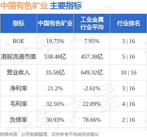 中国有色矿业港股市值538.48亿港元,在工业金属行业中排名第5。主要指标见下表: