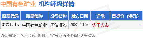 截至2025年12月19日收盘,中国有色矿业(01258.HK)报收于14.37港元,上涨4.13%,成交量1612.01万股,成交额2.27亿港元。投行对该股的评级以优于大市为主,近90天内共有1家投行给出优于大市评级。国信证券最新一份研报给予中国有色矿业优于大市评级。